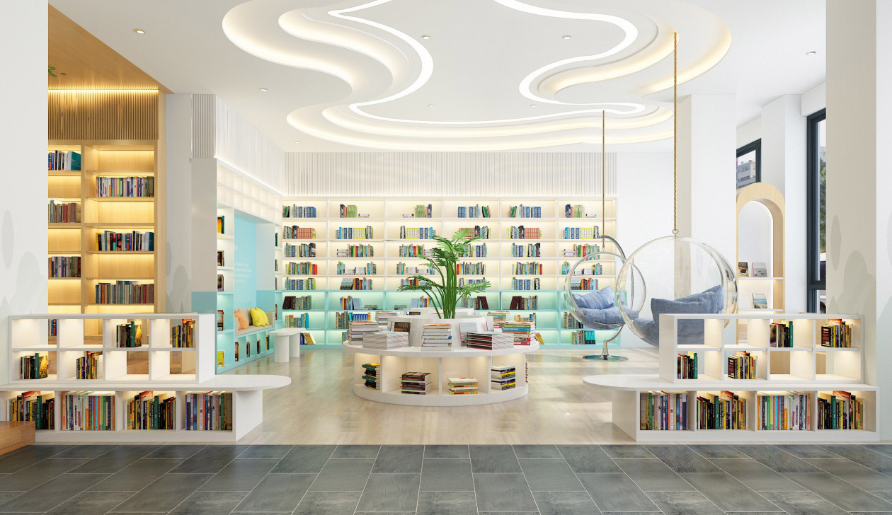 书店装修设计必须是明亮的,书店是最需要明亮光照的,卖场灯光的光照度,一般考虑500LX(流明值)至少不低于400LX(流明值)。长时间在昏暗或是灯光强烈的的环境下看书,会使眼睛疲劳损伤,所以要保持店内灯光柔和,这样也利于营造舒适安静的读书氛围,店内灯光的设计要考虑具体的功能区域,看书区的灯光要保持明亮,休憩区则保持柔和。