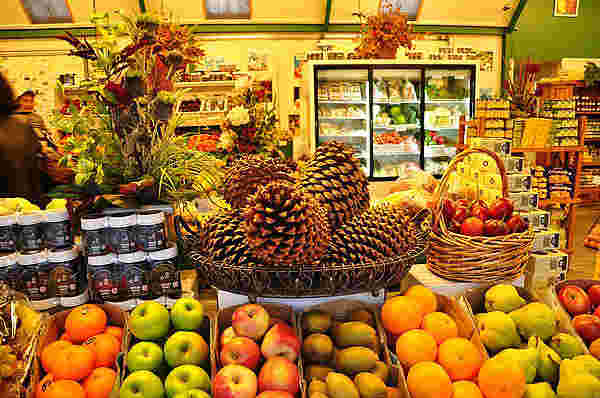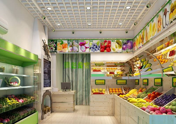 天花板的吊顶:不用太过复杂,但是要注意装饰,可以在天花板上悬挂一些塑料的绿色的枝叶和水果,以突出水果店的自然、绿色和健康。