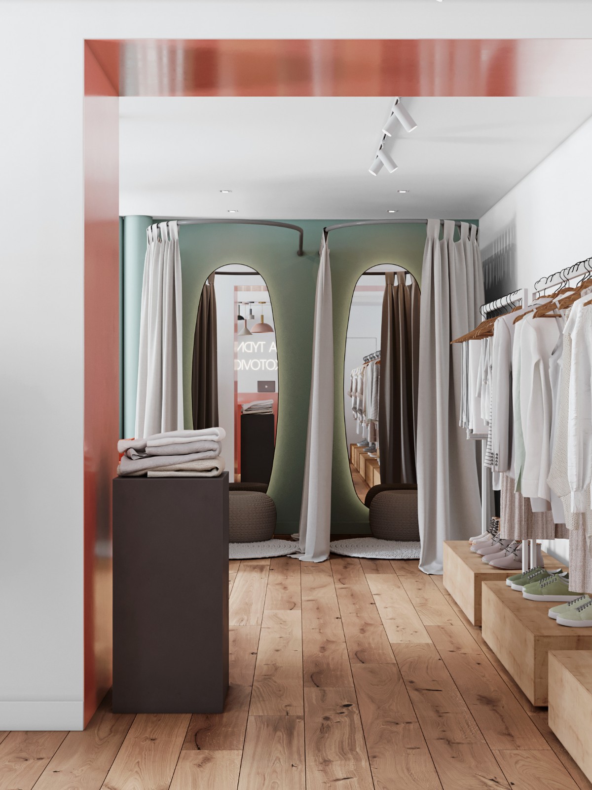 小服装店的一个法宝就是镜子。最好在墙上挂一面大镜子,让你的整体空间翻倍。地板的选择要注意材料和图案。地板要有质感,质量好。人们在服装店来来去去。如果人太多,很容易被损坏。如果地板质量太差,不仅会破坏美感,甚至会不小心伤害到顾客。