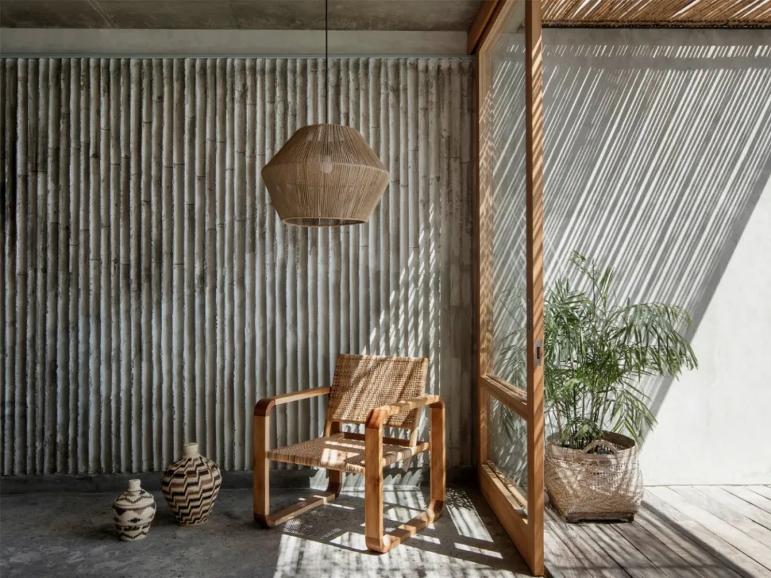 流程:基层找平→细木工板打底→竹模清水混凝土板反面施胶,结构胶(免钉胶)距板边距5cm处,打点状,点间距10~15cm,进行粘贴→细节处理→完成。