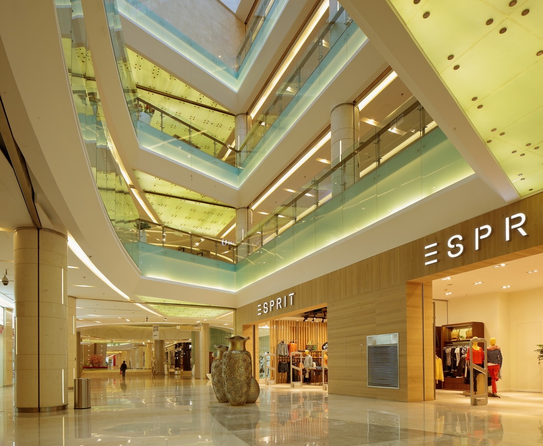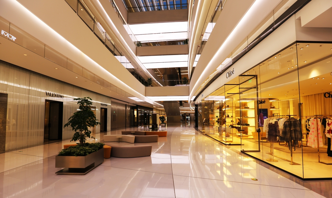 地面由于是水平面的,在人的视平线以下,其显露程度有限,侧界面垂直视线,显露程度理论上应最大,但不免受家具、货架的遮挡,而顶界面通常高于视平线,一览无余,它的造型、色彩、照明、光影效果等为形成丰富多彩的商业空间创造了良好的条件。对大中型商场及高档商店而言,大多数采用吊顶棚,以便综合考虑照明、空调、喷淋、烟感等位置,在此基础上综合外观设计,其他有暴露顶棚,悬挂织物等手法处理顶界面。