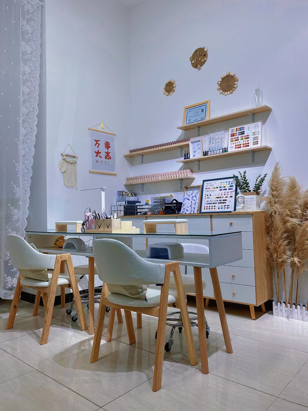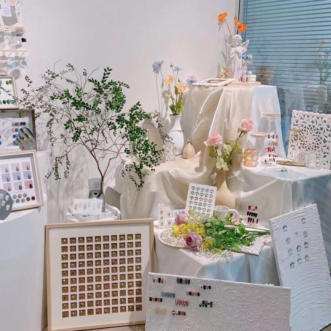 除了以上提到的接待区、美甲区,剩下的空间也需要利用起来。如:阳台可以摆放数盆绿植来增加室内的活力感,还可以放些小书架,放些美甲有关的杂志供客人观看。一些空白的墙面上还可以挂一些最新的美甲款式或是近期热销的美甲款式,让客人有了更好的选择。