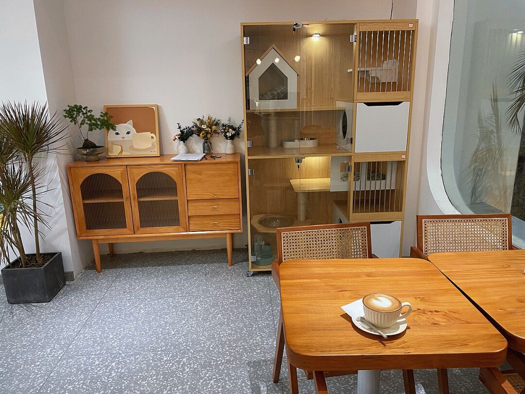 设置开放式餐饮操作台及桌椅板凳,应隔着玻璃可看见撸猫空间及猫咪展示区(用于展示的猫咪或撸猫区下班的猫咪)。无论是让对猫咪过敏的人可以隔着玻璃吸猫,还是防止猫毛,猫皮屑等污染掉人用食品。减少不必要的投诉。