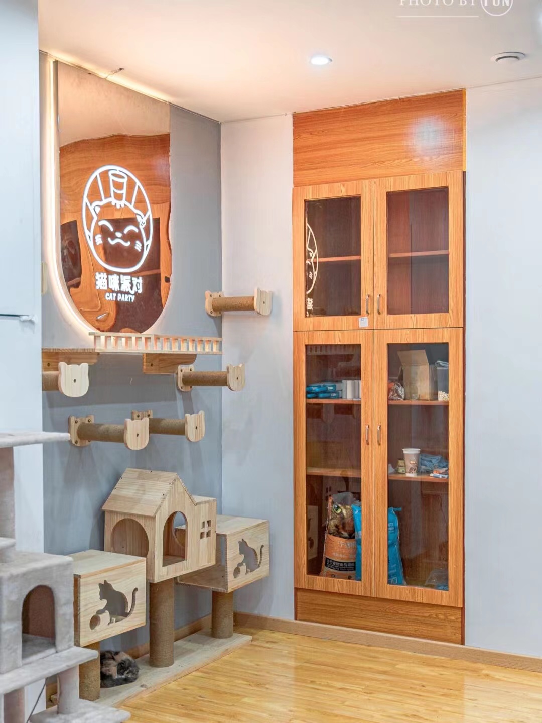 猫咪展示区不仅可以展示店内猫咪,而且当猫咪生病的时候也可以起到一个隔离的作用。需定制或者让木工制作猫笼、猫柜、猫别墅。撸猫空间是一个与猫咪亲密互动的场所,包含猫咪乐园,书架,桌椅板凳或榻榻米。