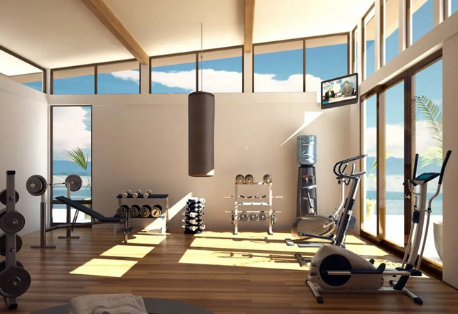 5、通风与采光。健身房装修时可以在室内安装落地窗,保证空气自然充足流通,同时保证健身房光源的充足,也可以挂些全身镜,让大家照到自己努力运动的样子。