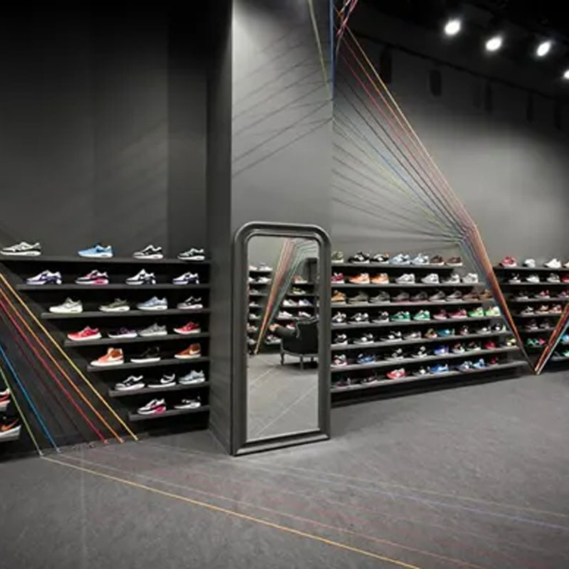 在装修运动鞋店的时候可以选择运动感、力量感的风格,黑白色的简搭,稳重且有韵味,也突出自己的品牌,开门见山,加上柔和的灯光,尽显华丽。可以加入一些鲜艳的颜色,以增加空间的时尚感以及活跃感。运动鞋店,一定要避免死气沉沉的装修风格,这样会把顾客拒之门外的。