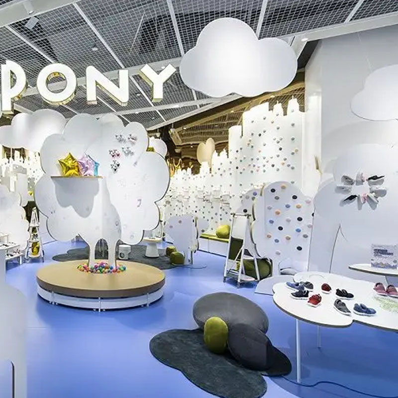 孩子的内心是天真而富有好奇性的,他们对世界的认知和接受从视觉接触开始,一般选择可爱风格就可以,使用活泼烂漫的颜色。加上孩子喜欢的卡通人物作为背景装修,或是摆上玩偶,可以很好地吸引孩子进店,满足孩子活泼好奇的心理。