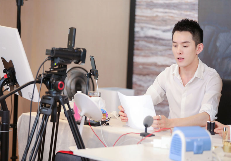 针对化妆品直播间设计,背景避免复杂装饰,色彩的饱和度应较低,避免俗气。搭配颜色可结合需要自由选择,装饰上可以结合网红装饰道具,也可以结合自身产品包装盒,砌起产品墙。台面造型有一定弧度为佳,台面设置挡板,顾客看到不觉得杂乱无章不舒适,台面尽量简易,详细,有节奏感。直播间的灯光效果一定要好,柔和的灯光,这样才能凸显美妆效果。避免色差明显,手臂试色帮助肤色搭配上妆,激发顾客体验。