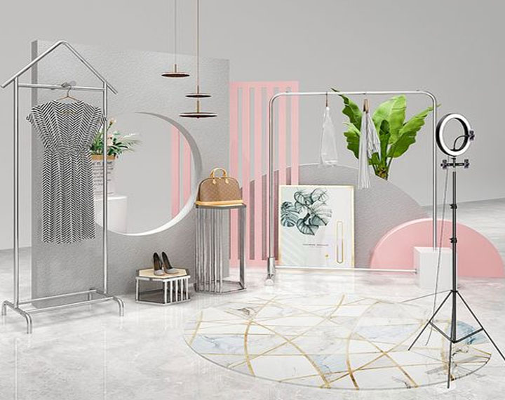 为了直观的展示服装穿搭效果,直播间环境要保持光线清晰、环境敞亮、可视物品整洁即可。直播间最好以浅色纯色背景墙为主,以简洁、大方、明亮为基础打造,不能花哨,因为杂乱的背景容易使人反感。直播间里最重要的设计要数灯光的设计了,白色日光灯条形分布,光线明亮,使直播间内部空间更加清透,这样会让观看直播的人更有购买的欲望。