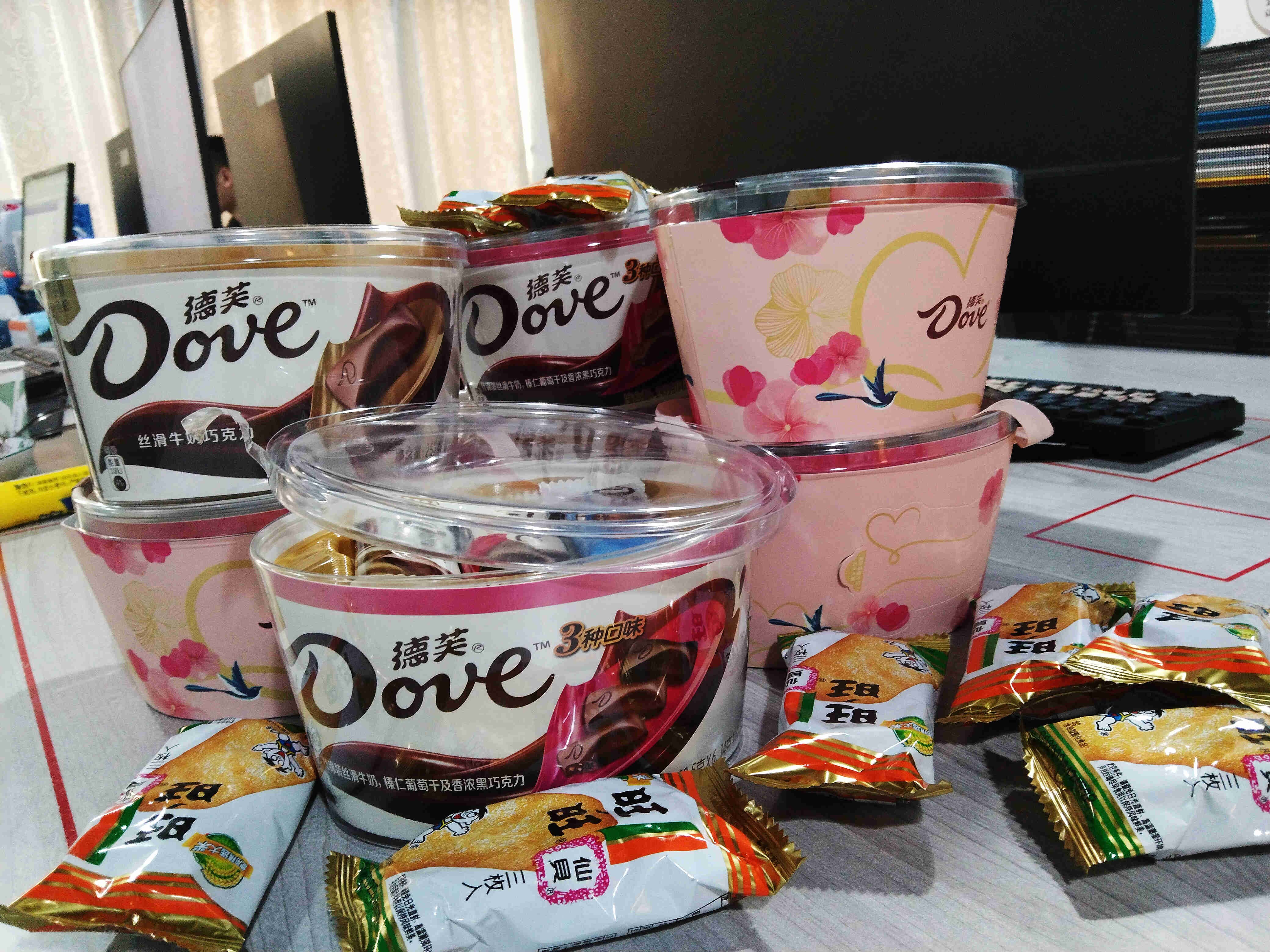 七夕节当天,特地为大家准备了巧克力和旺旺小饼干、饮料。希望生活甜蜜。事业旺旺!