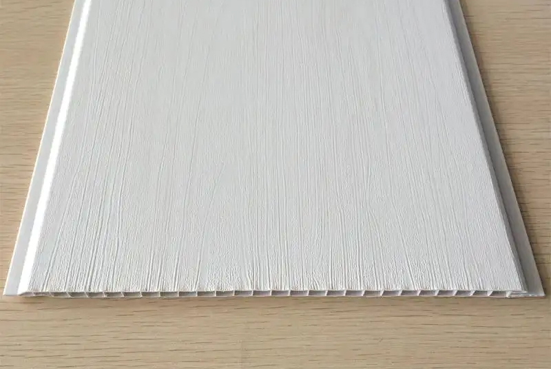 6、塑料扣板安装,将扣板按条平行的扣在龙骨上,采用专用的连接件固定。等安装最后一块扣板时,要根据实际尺寸,裁切好,将面板弯曲一些安装进去。